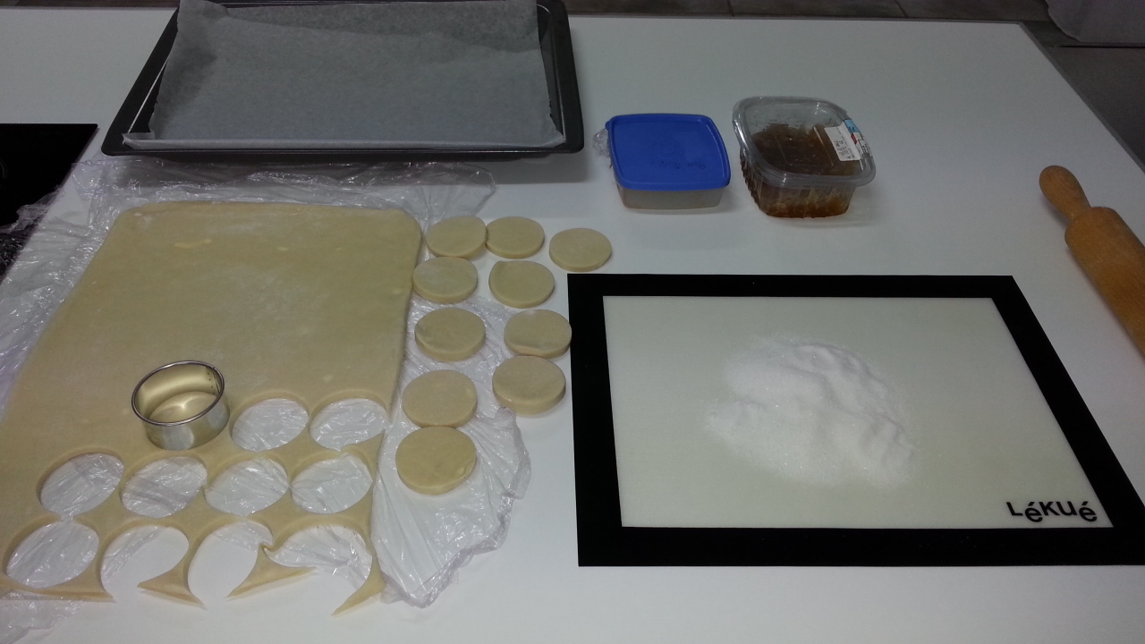 8 Extienda la masa sobre una superficie espolvoreada con harina (aprox. 50 x 40 cm). Corte 16 discos de Ø 9 cm. Retire la masa restante.
