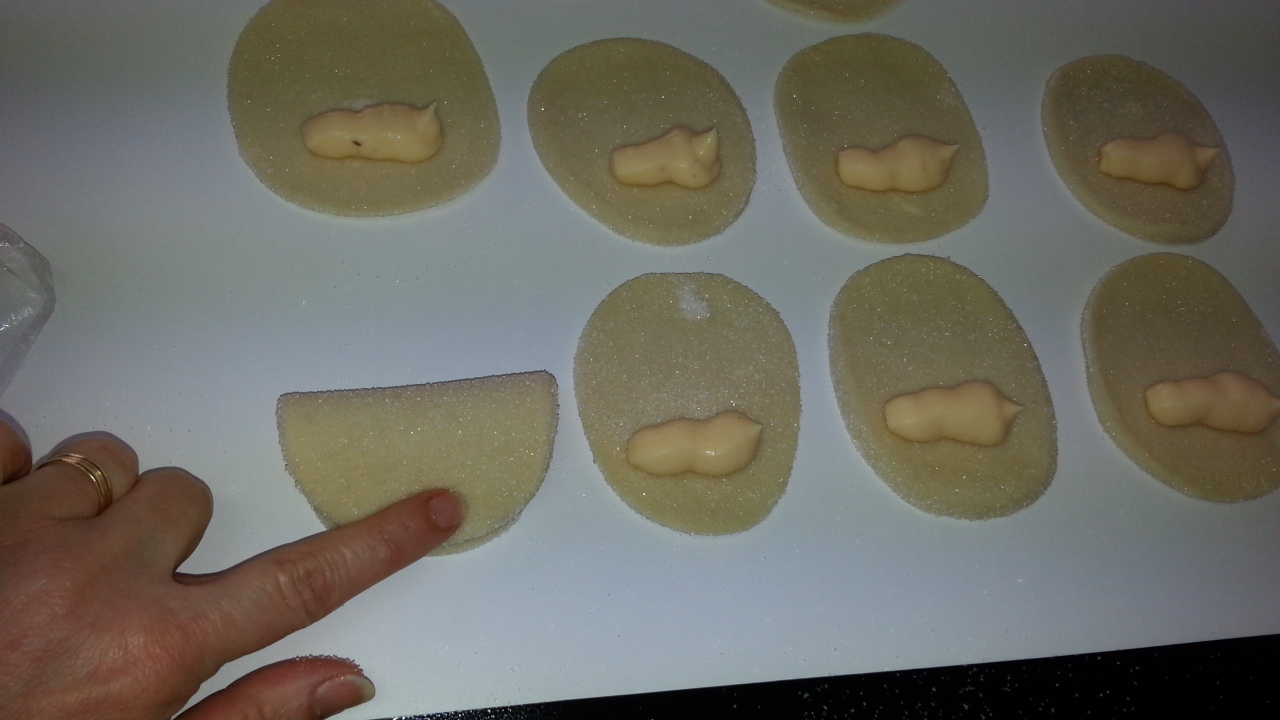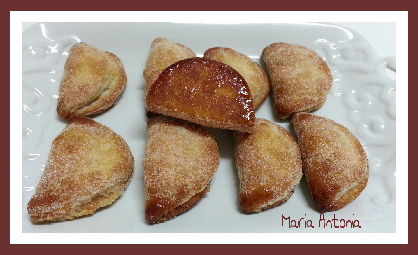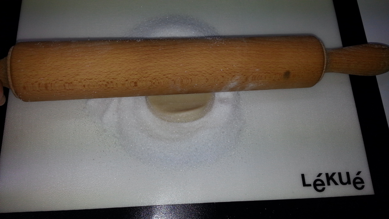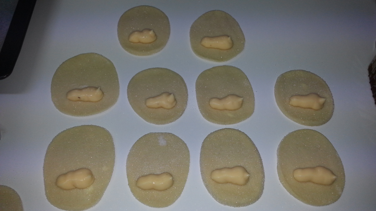 9 Precaliente el horno a 215°C. Forre una bandeja de horno con papel de hornear. 10 Espolvoree la superficie de trabajo con un poco de azúcar y ponga encima un disco de masa. Espolvoree con otro poco de azúcar y con un rodillo estire la masa para darle forma ligeramente alargada. Ponga un poco de crema pastelera sobre la parte inferior de la masa. Humedezca los bordes con agua y cierre presionando un poco la masa. Repita esta operación con cada relleno .Colóquelos en la bandeja de horno preparada y deje reposar en el frigorífico durante aprox. 30 minutos.