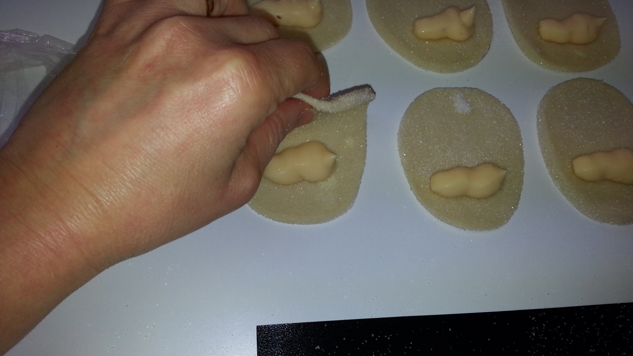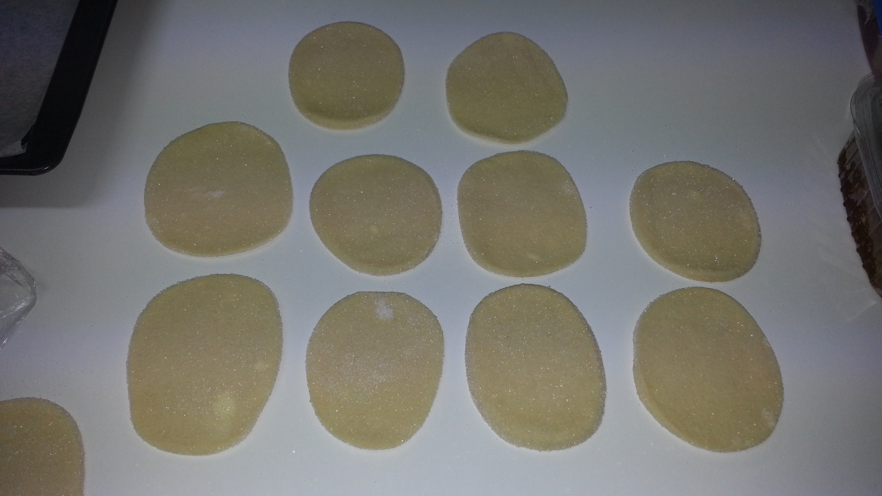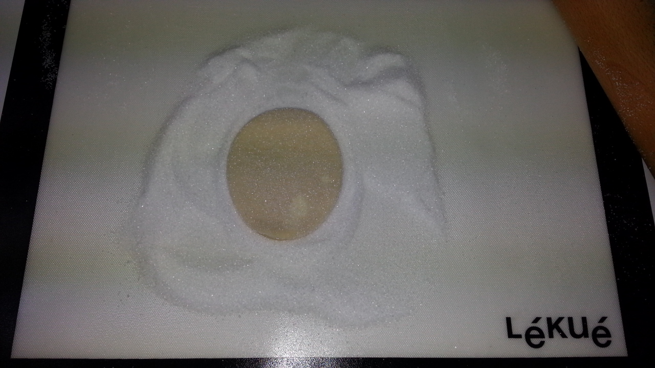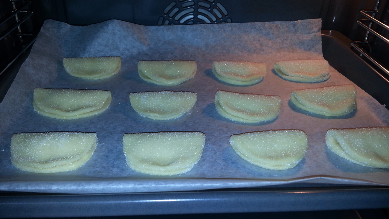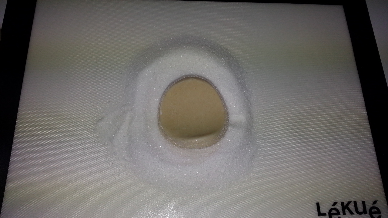 9 Precaliente el horno a 215°C. Forre una bandeja de horno con papel de hornear. 10 Espolvoree la superficie de trabajo con un poco de azúcar y ponga encima un disco de masa. Espolvoree con otro poco de azúcar y con un rodillo estire la masa para darle forma ligeramente alargada. Ponga un poco de crema pastelera sobre la parte inferior de la masa. Humedezca los bordes con agua y cierre presionando un poco la masa. Repita esta operación con cada relleno .Colóquelos en la bandeja de horno preparada y deje reposar en el frigorífico durante aprox. 30 minutos.