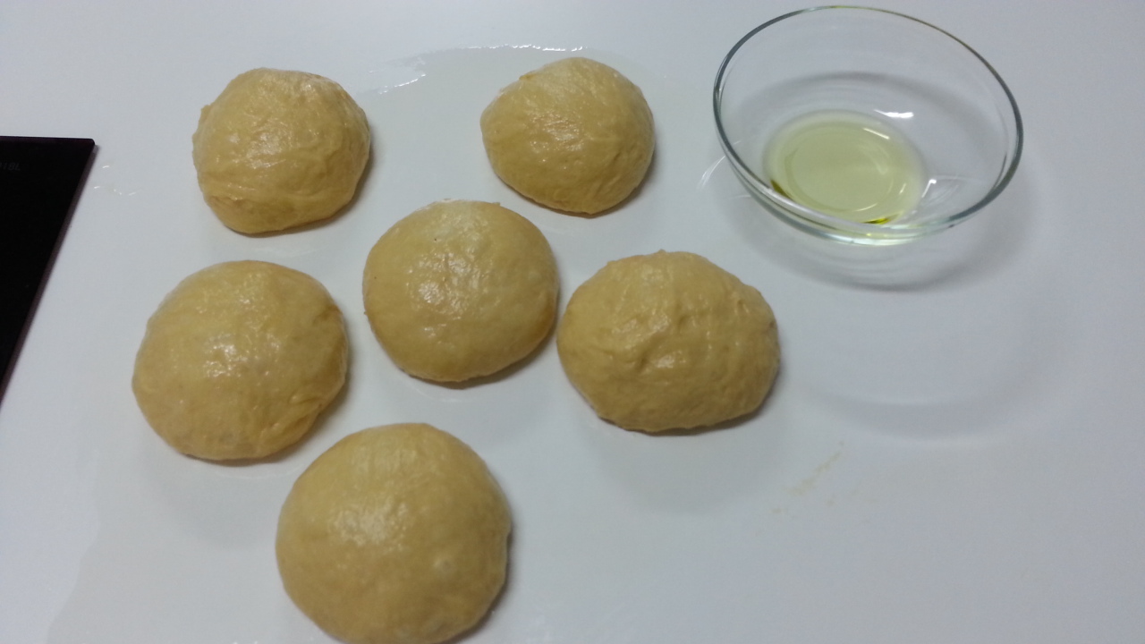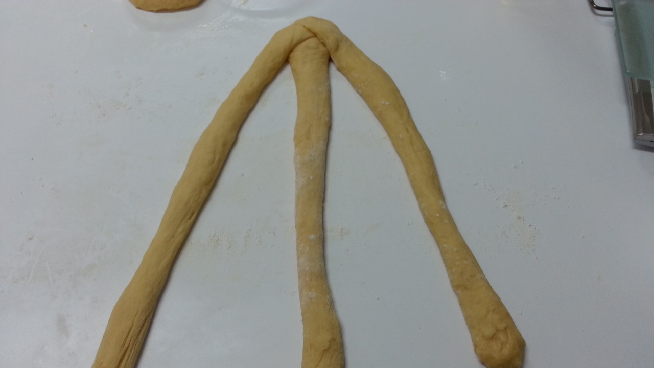 Repartesc la masa amb 3 parts les estir amb les mans amb unes gotetes d'oli com si fosen pals despres vaig fent la trenza .