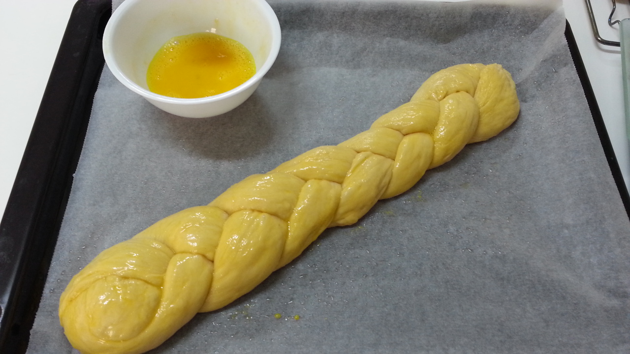 Despres unt la trenza amb ou amb un pinzell i el deix tovar