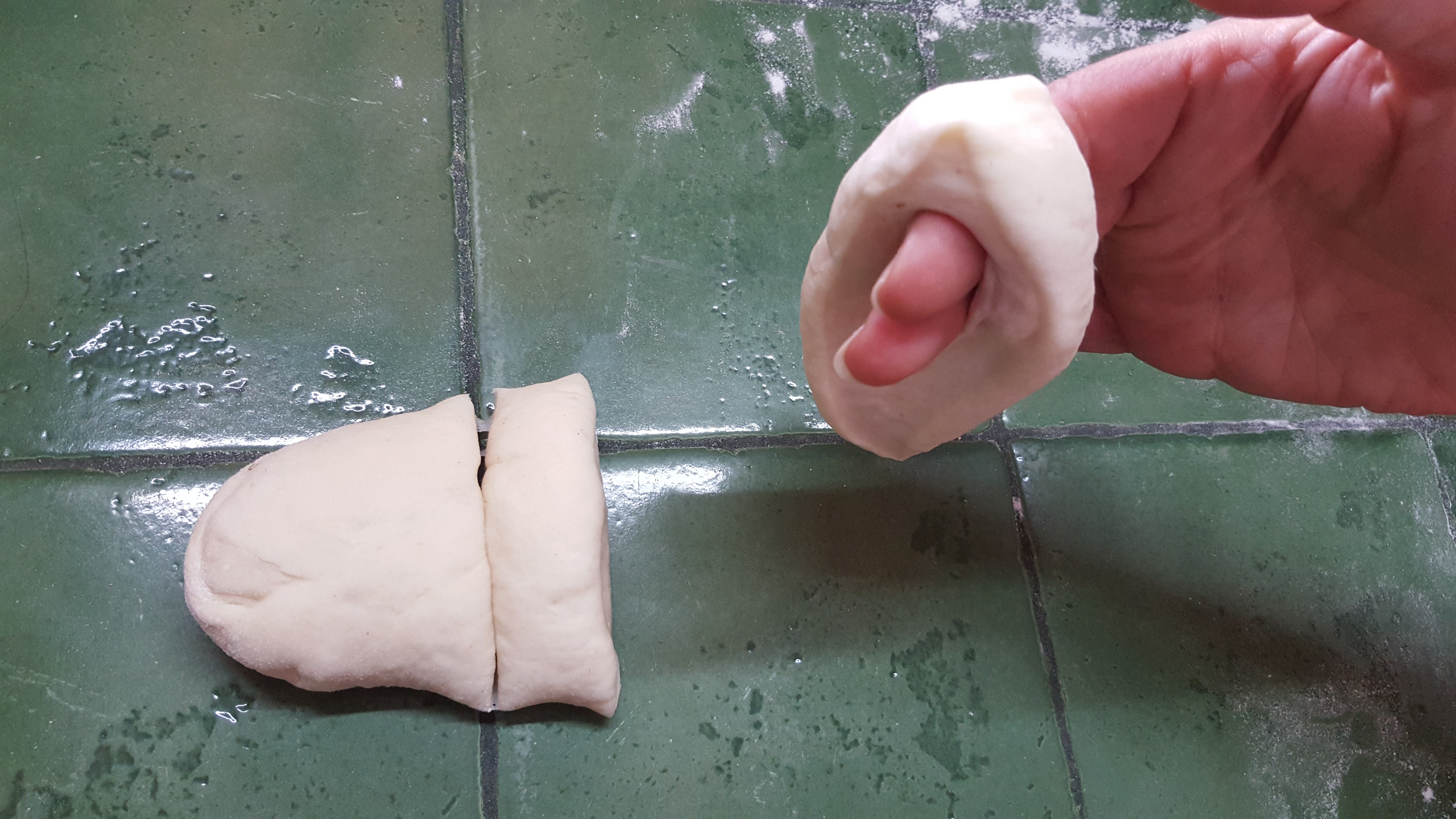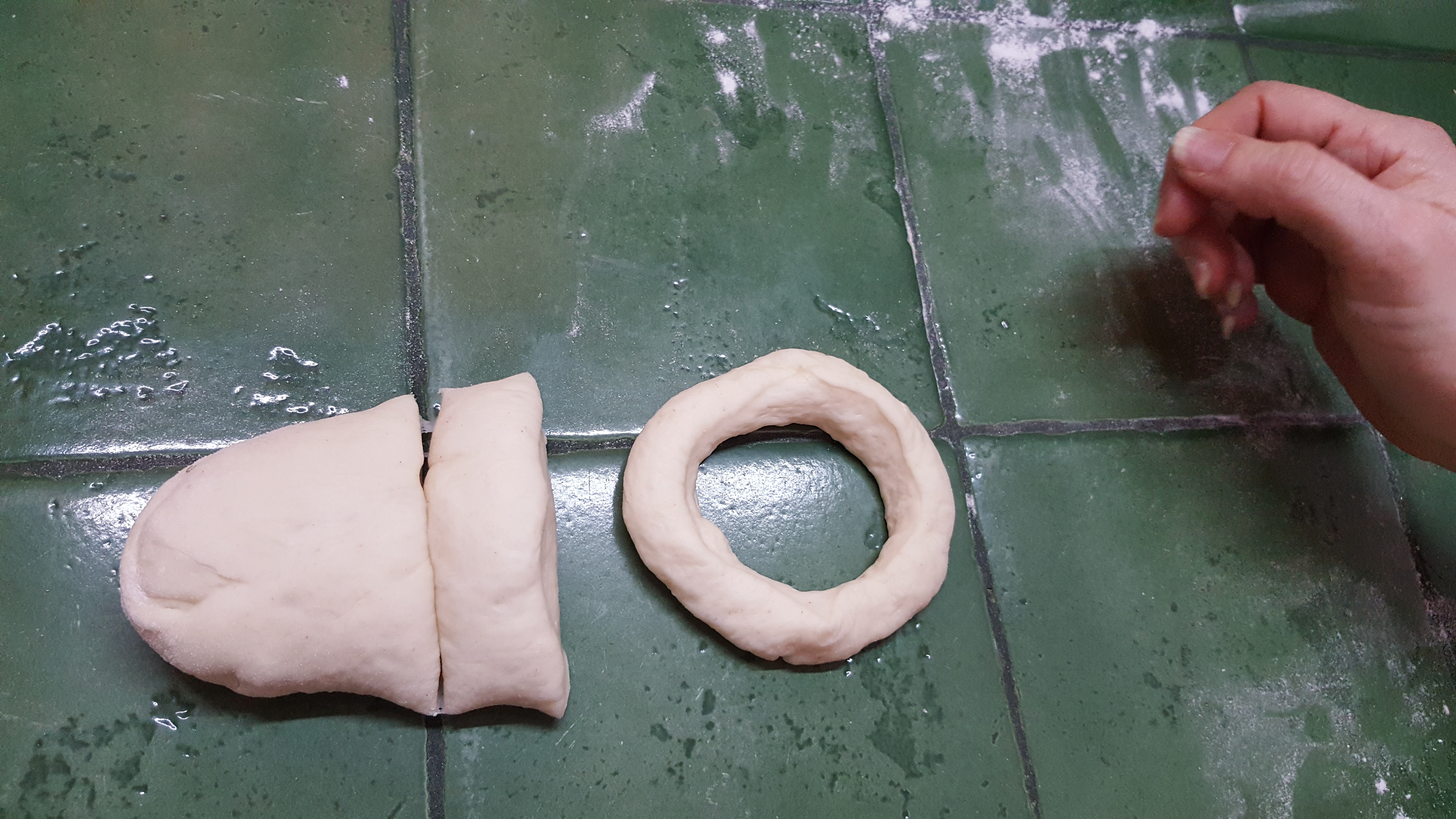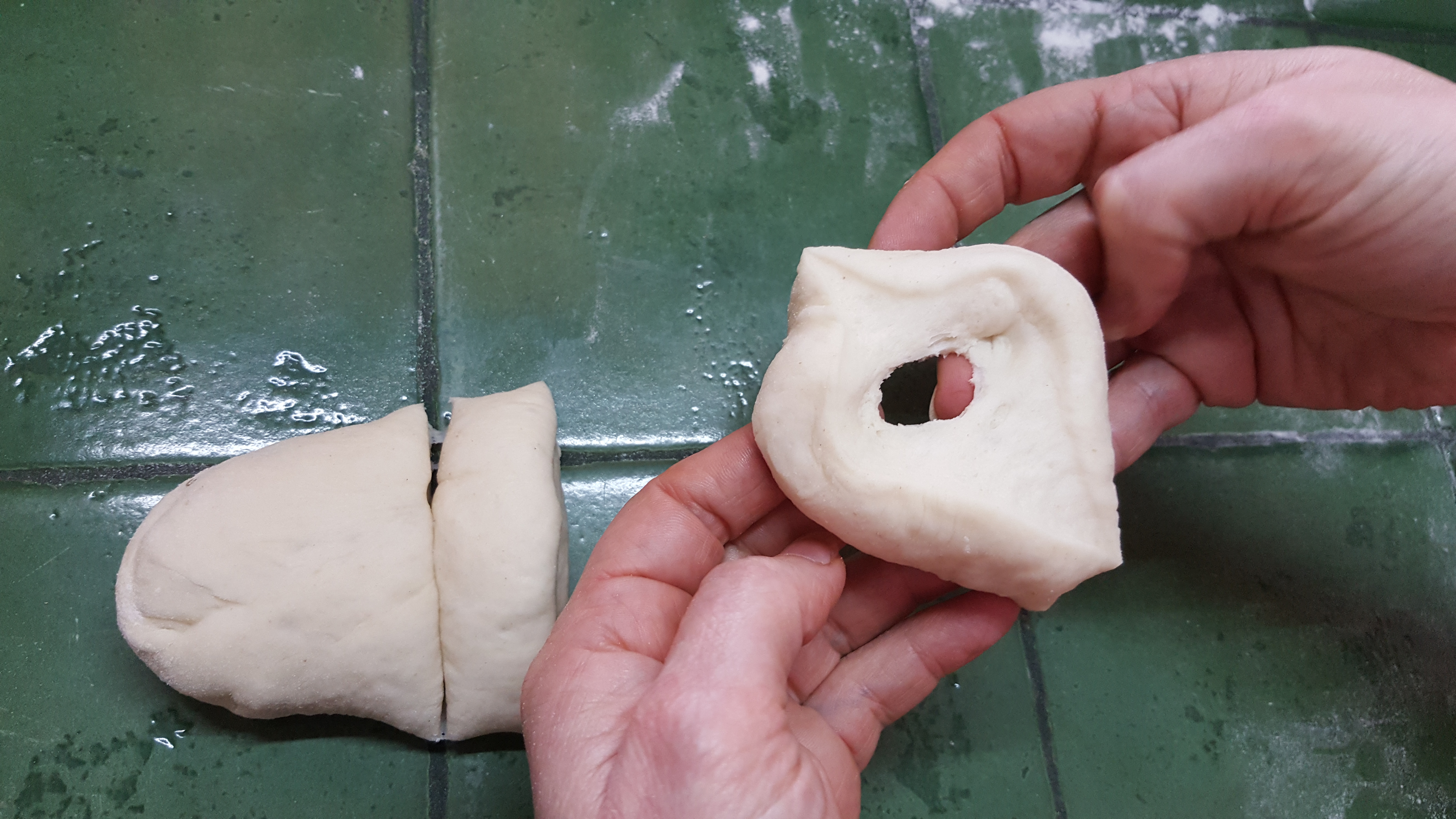 Cuando la masa haya subido, la volcamos sobre una superficie de trabajo enharinada, la amasamos ligeramente y damos forma de cilindro (de aprox. 27-28 cm. de largo). Cortamos el cilindro en 11 trozos, les damos forma de bola y las cubrimos con un paño para que no se resequen. Cogemos cada bola de masa (sin dejarlas reposar) y con el dedo hacemos un agujero en el centro, estirando la masa para darles forma.