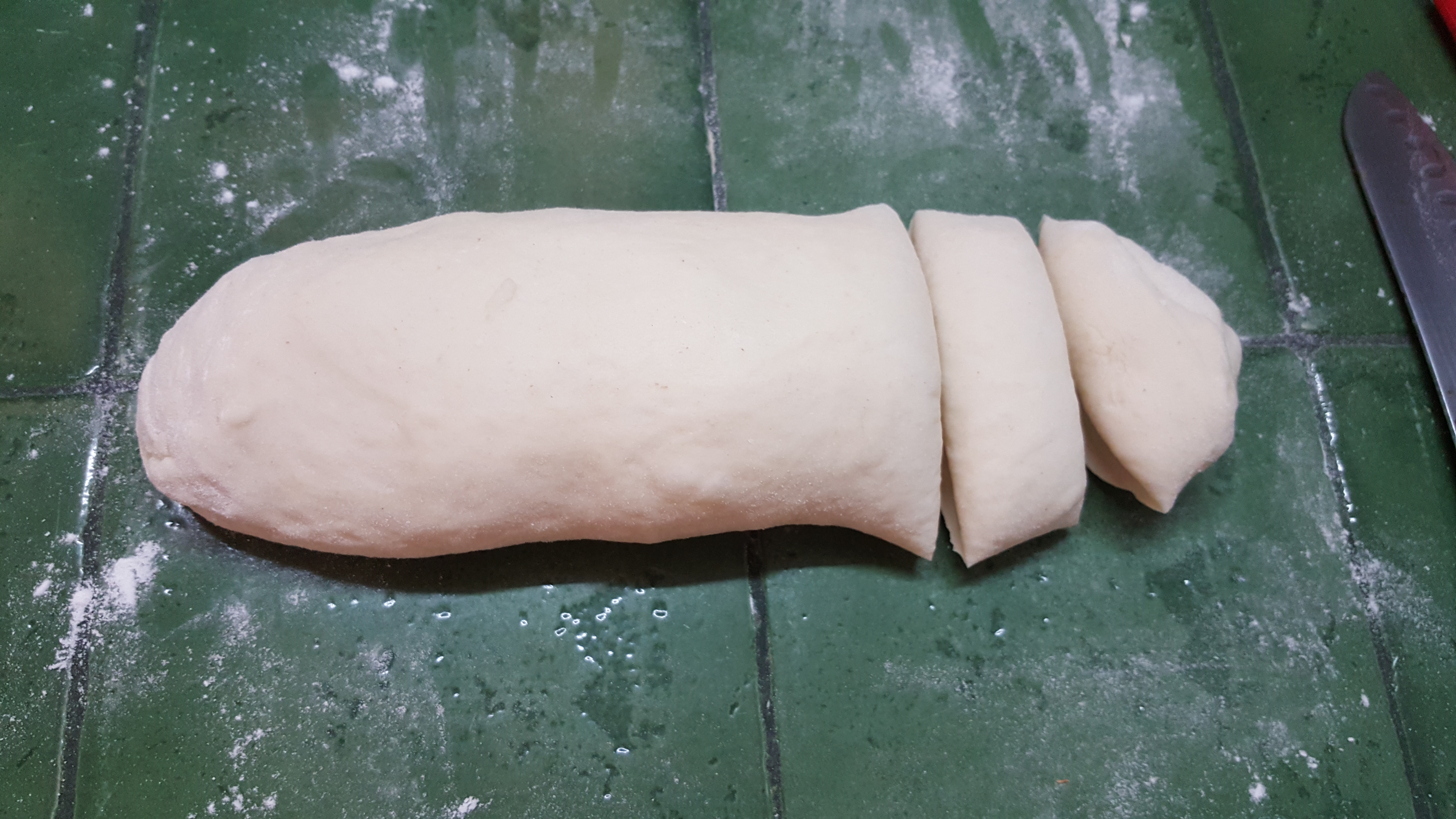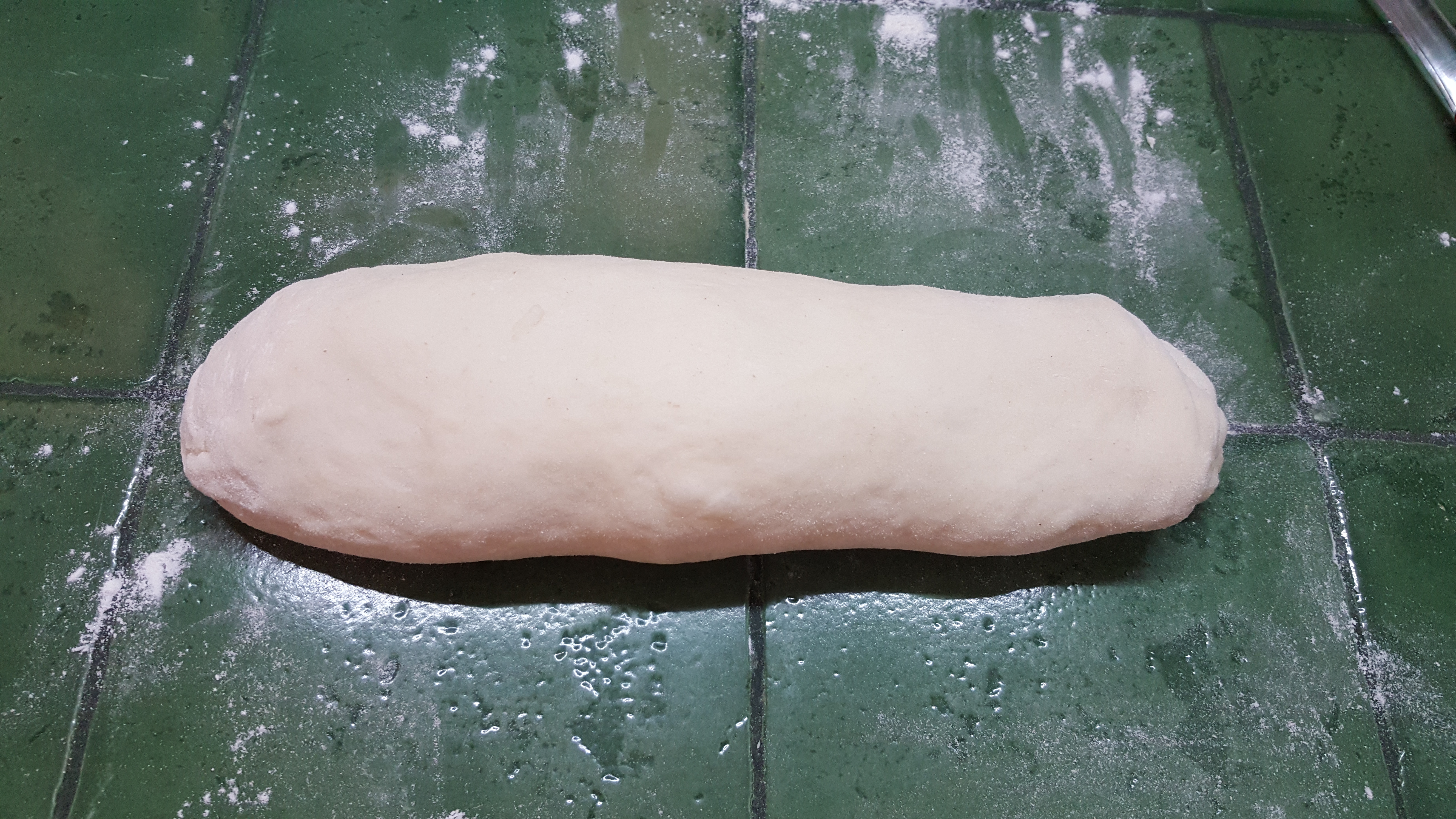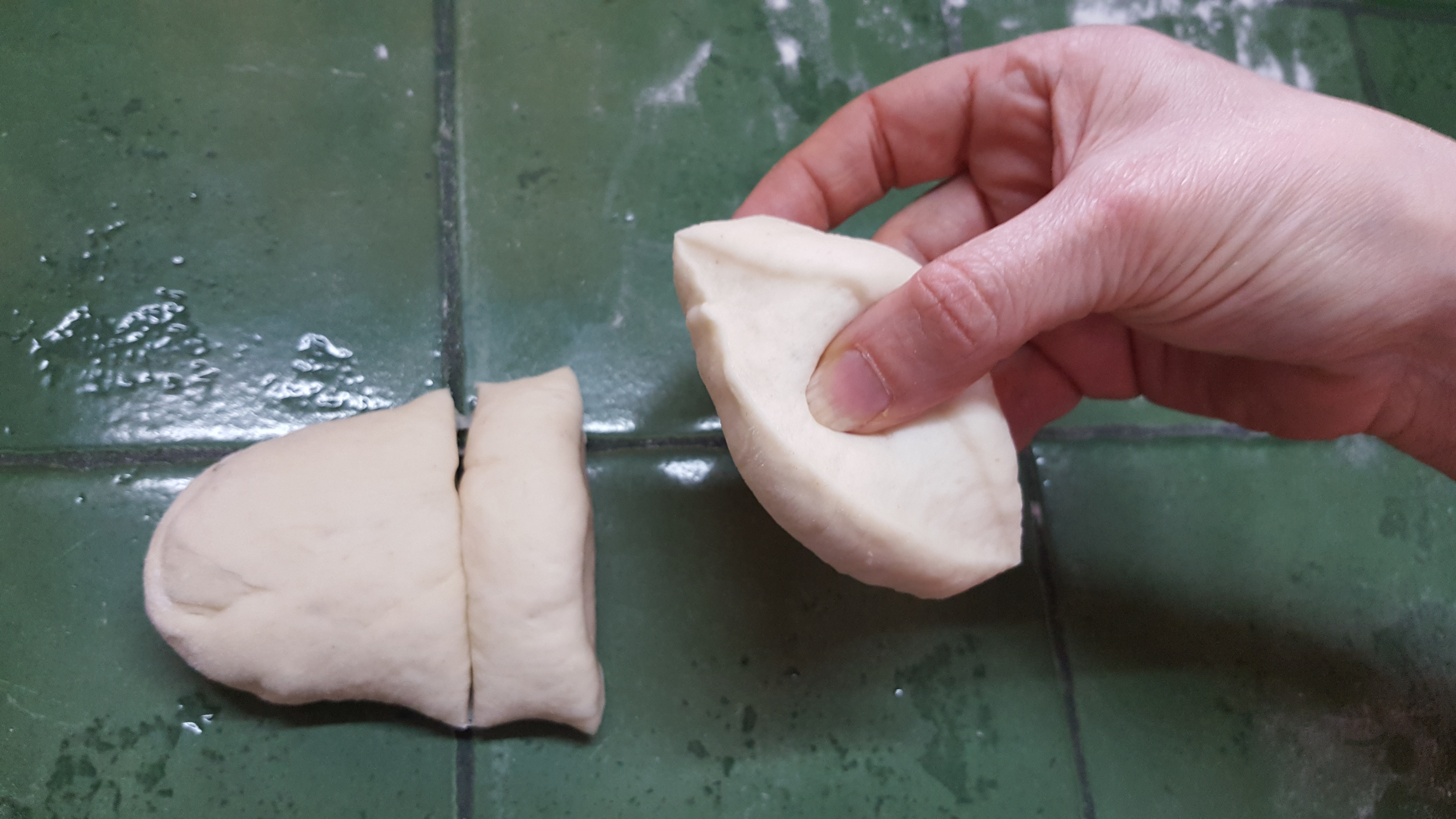 Cuando la masa haya subido, la volcamos sobre una superficie de trabajo enharinada, la amasamos ligeramente y damos forma de cilindro (de aprox. 27-28 cm. de largo). Cortamos el cilindro en 11 trozos, les damos forma de bola y las cubrimos con un paño para que no se resequen. Cogemos cada bola de masa (sin dejarlas reposar) y con el dedo hacemos un agujero en el centro, estirando la masa para darles forma.