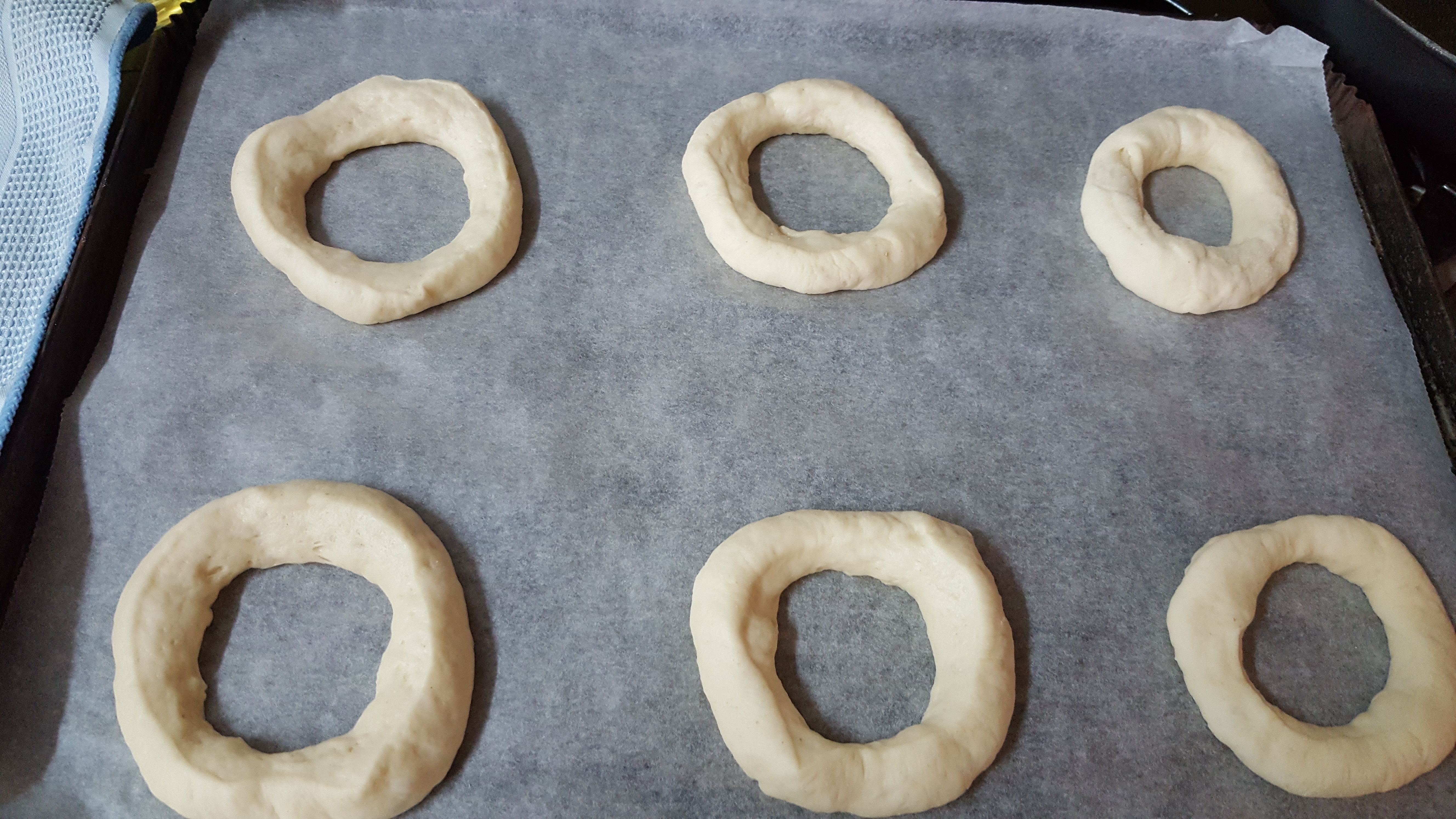 Colocamos los bagels en dos bandejas de horno forradas con papel de hornear y dejamos que reposen durante 20 minutos, cubiertos con un paño.