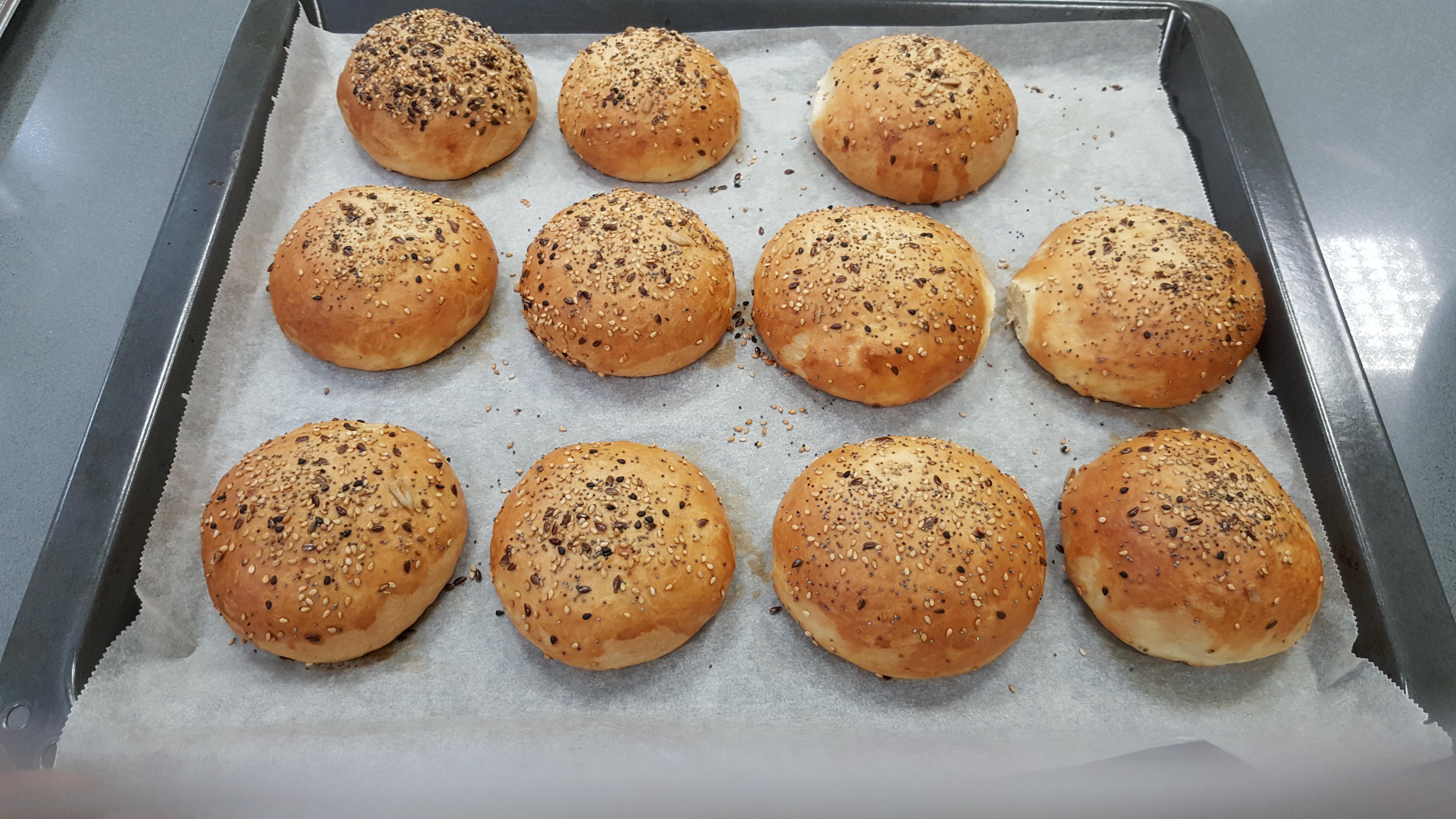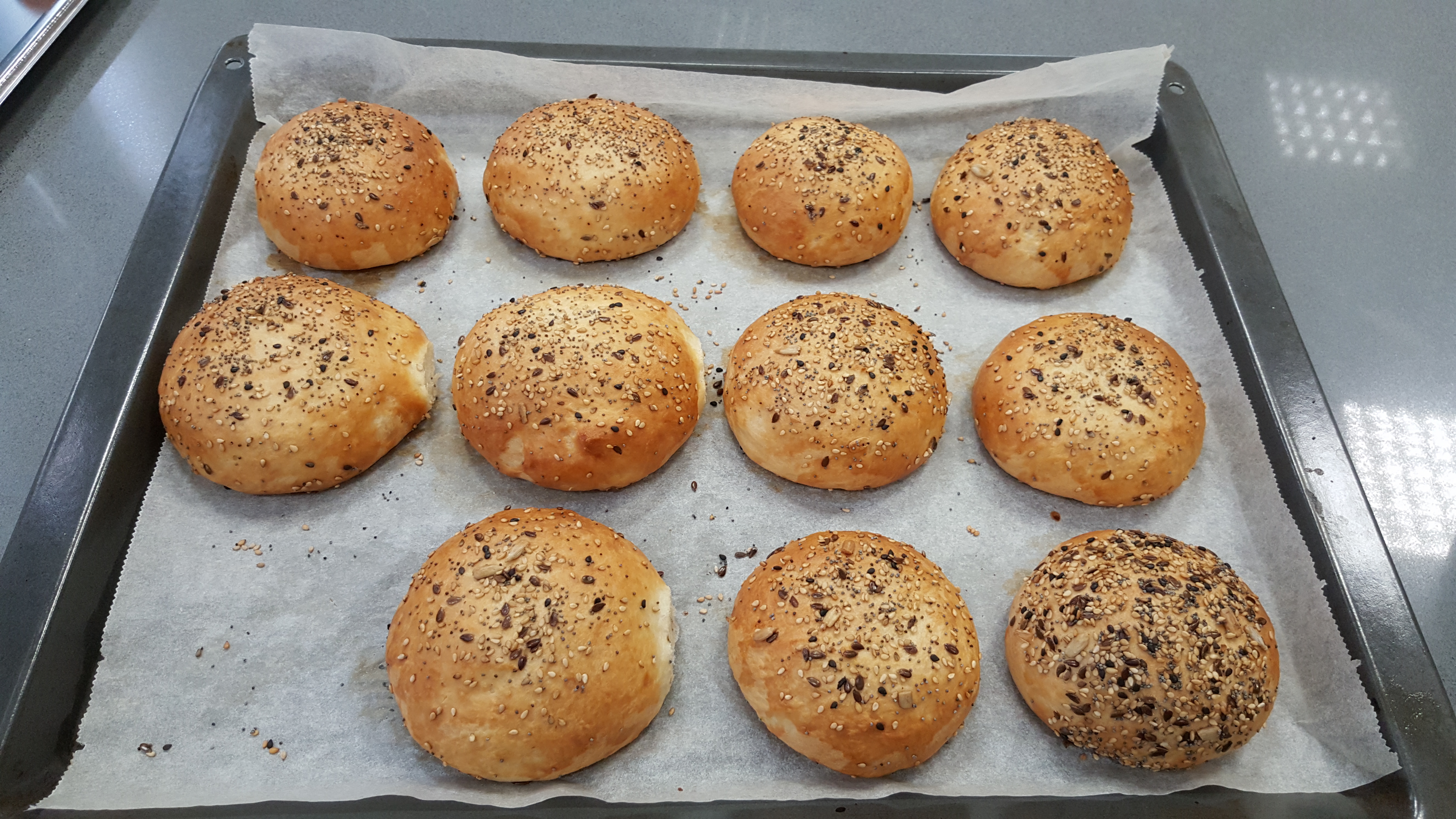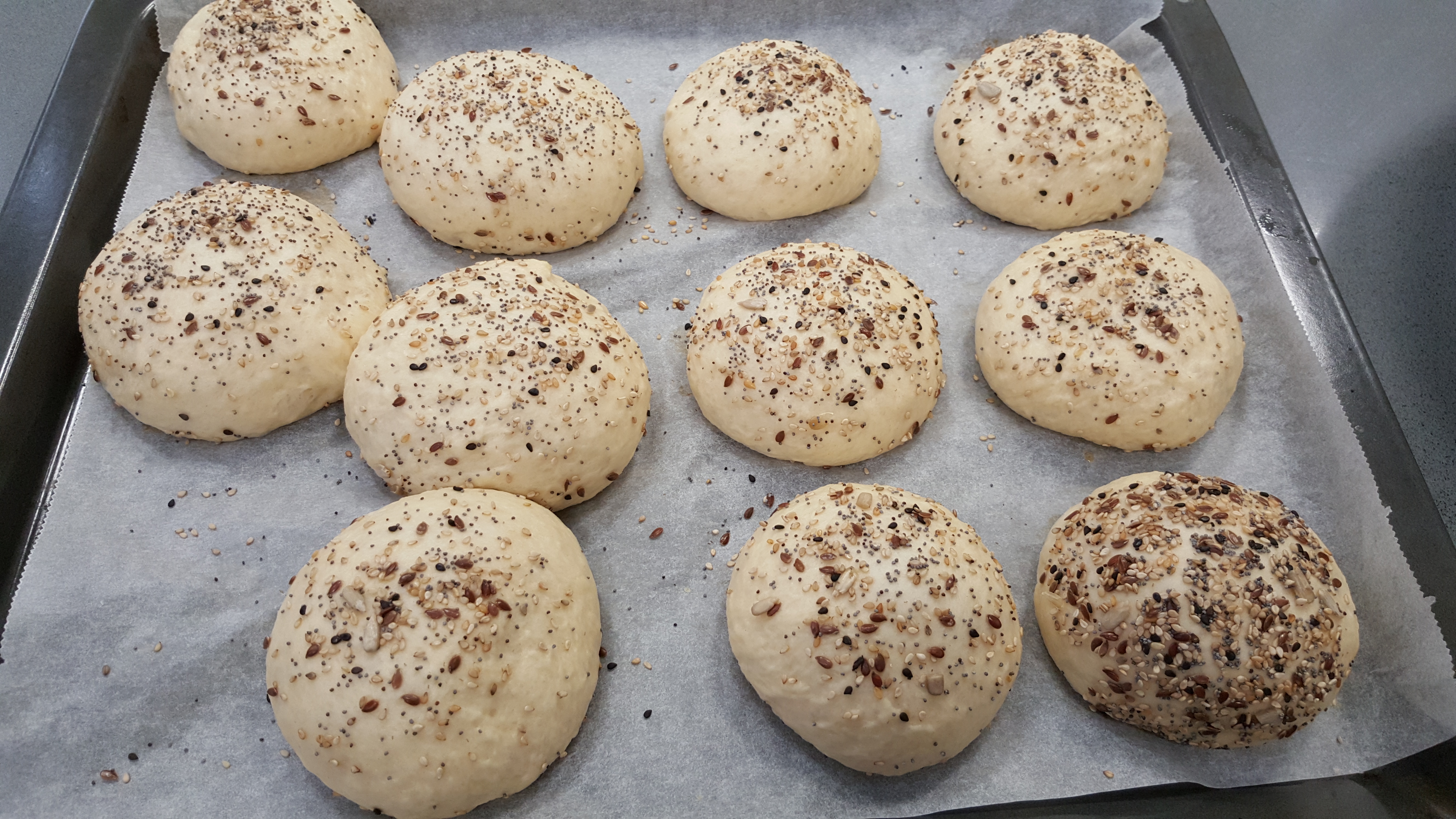- Sacamos la masa del vaso y vamos haciendo porciones de panecillo o alargados o redondos, colocarlos en una bandeja de horno pintarlos de huevo batido y espolvorear las semillas, aplastar un poco las semillas con la mano y dejar fermentar hasta que doblen el volumen, hornear 20 minutos a 180º, una vez cocidos deje enfriar sobre una rejilla.