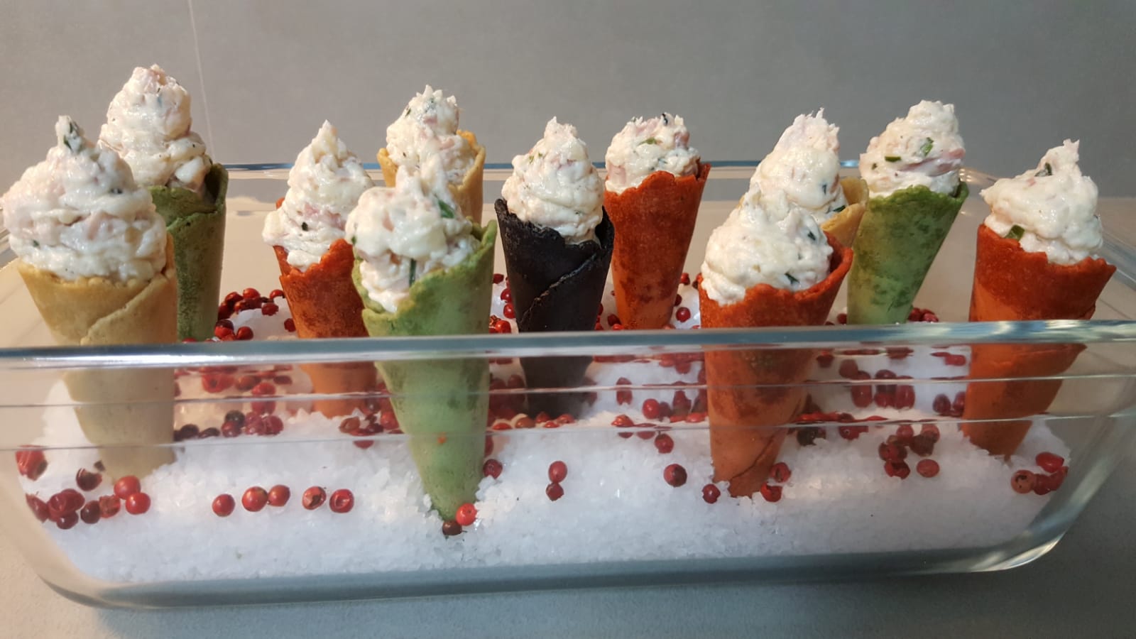 Esta receta se puede preparar sobre canapés de pan, sobre tartaletas o en estos conos tan vistosos que venden en lidl en época navideña. Están deliciosos y muy fáciles de preparar