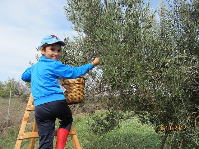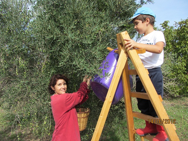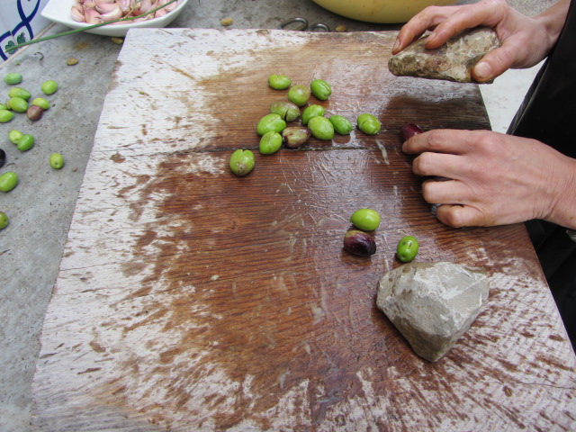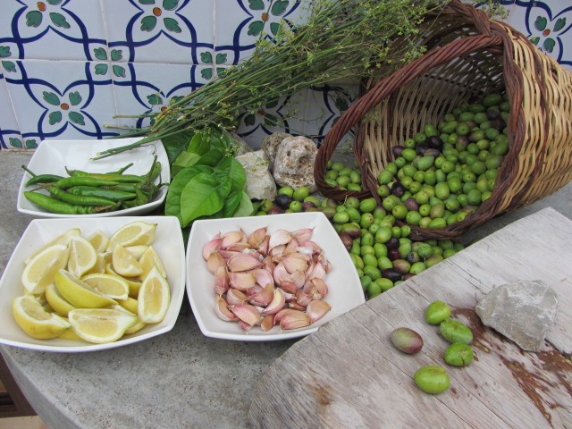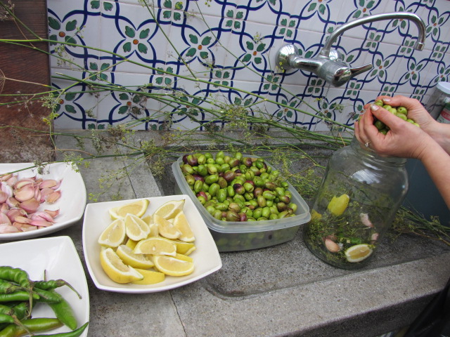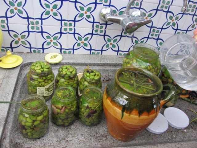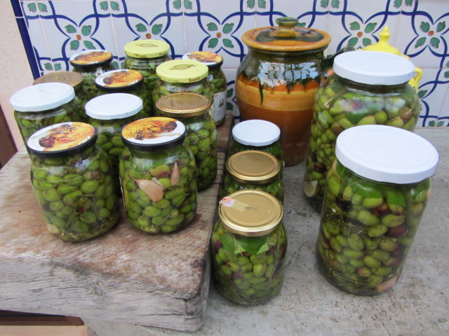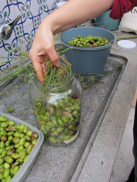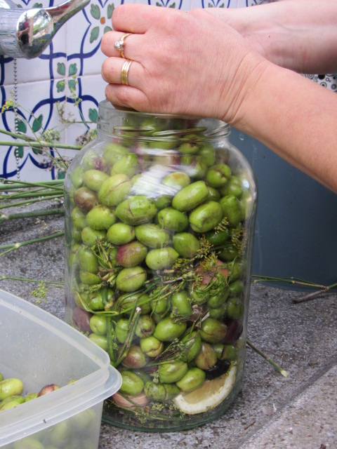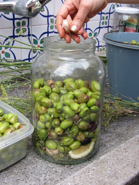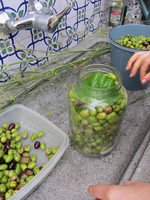 | Collim ses olives verdes i sense fer-les netes se trenquen amb una pedra damunt una post.Embruten molt, podeu collir una bossa de plàstic grossa i vos feis un "vestit" amb ella perque esquita molt i fa taques. tallam trossos de llimona. Dins un pot gros posam un llit de bastant de fonoll (llavor i tronquet incluit),afegim un parell d'alls al gust,prebe covent verd al gust (per un pot gros pos 1 prebe sencer i per un pot petit la meitat), després omplim de les olives trencades. Quan tenim mig pot ple, torn posar bastant de fonoll, cualque all més i algun tros de llimona. Acabam de omplir els pots i per tancar es posa una o dues fulles de llimonera per fer "de tap" i amb dos tronquets de fonoll es fa una creu preque quan posem l'aigua-sal no pujin a la superficie. Aixi quan les encetam llevam aquesta "capa" i les primeres olives ja son bones. Dins un poval gros posam aigua de cisterna i començam a abocar-li la sal (uns 100 gr per 1 litre més o manco), amb un pitxer omplim els pots de l'aigua salada, tapam i a guardar dins el rebost dos o tres mesos com a mínim. Tothom a collir oliva |