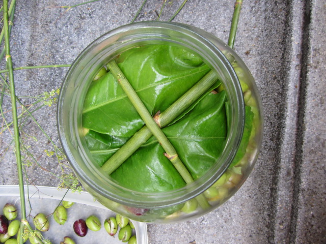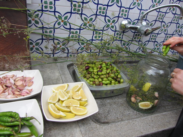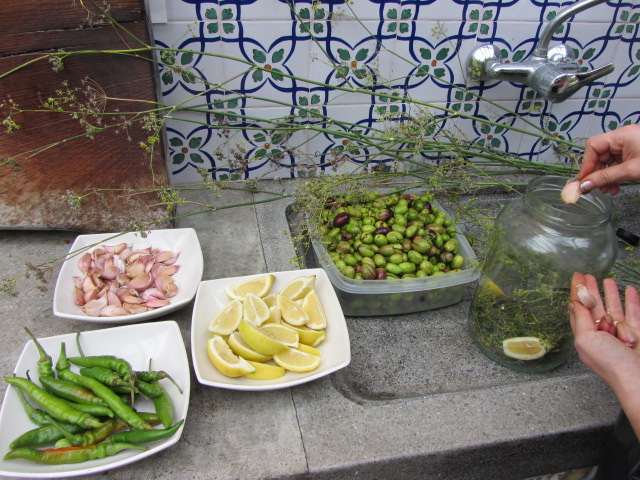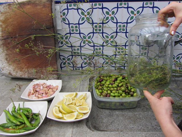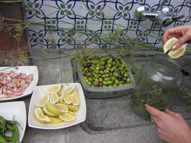| tots els ingredients a punt començam a trencar ses olives amb una pedra (pensau amb l'invent de la bossa de plàstic com a "vestit" ) primer posam un bon sostre de fonoll ( jo en pos molt ) ara posam uns quants trossos de llimona, dos o tres un parell d'alls al gust 4 o 5 prebe covent al gust ( 1 prebe per un pot gros i mig per un pot més petit ) començam a omplir el pot d'olives a meitat del pot un poc més de fonoll, alls i llimona tapam amb una fulla de llimonera o dues i amb dos bastonets de fonoll feim una creu . feim l'aigua-sal omplim els pots, esperam una estona per si s'han de omplir una mica més i tapar ben tapats.