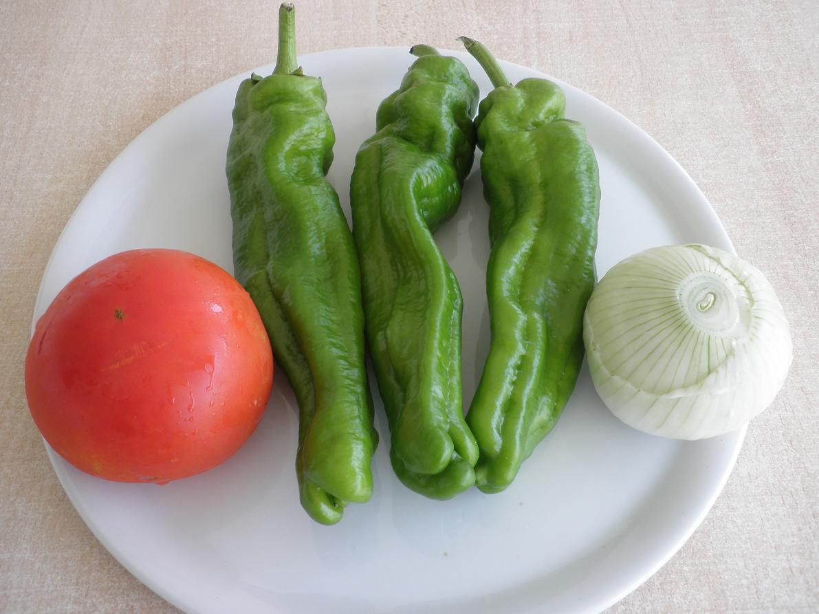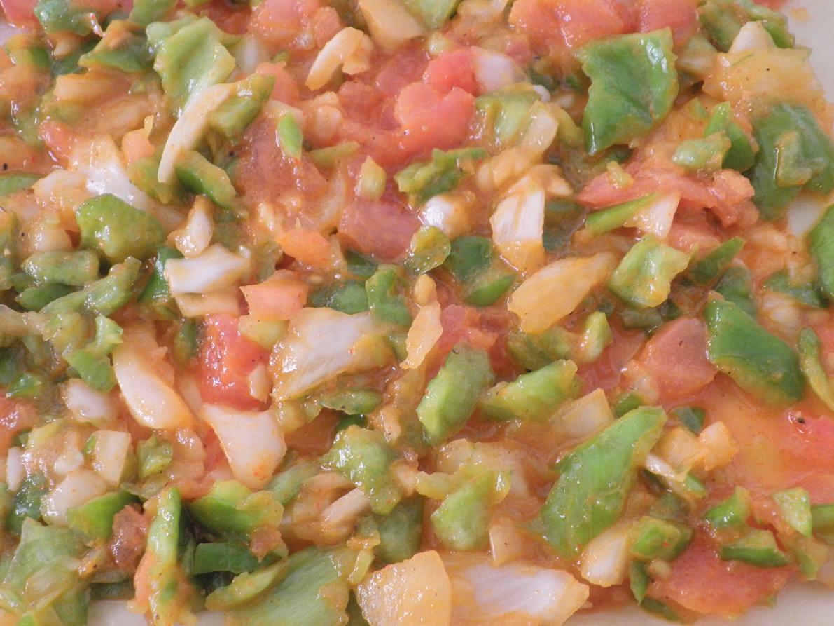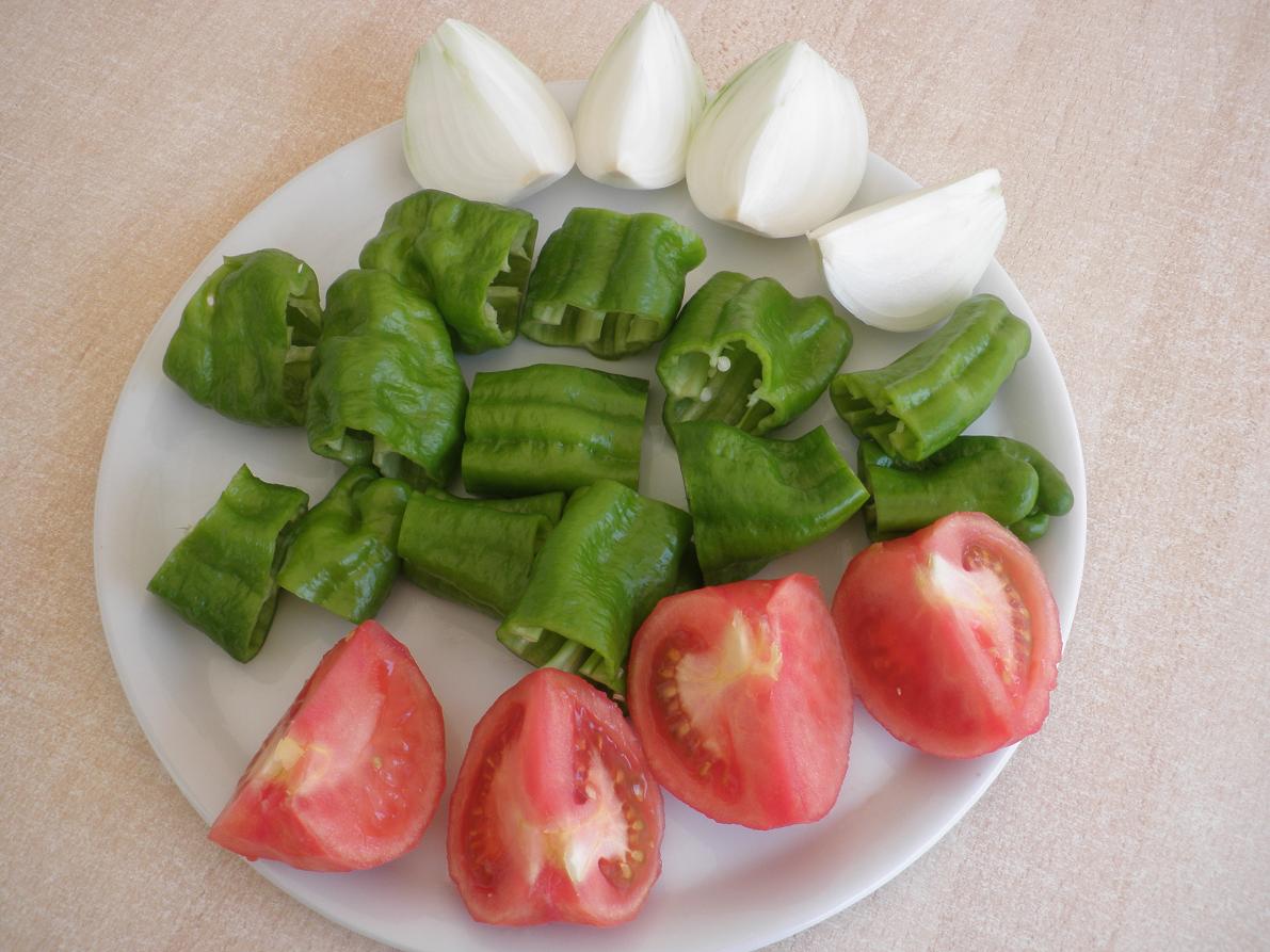 El pimiento verde cortado a rodajas también mas o menos del tamaño de un huevo.