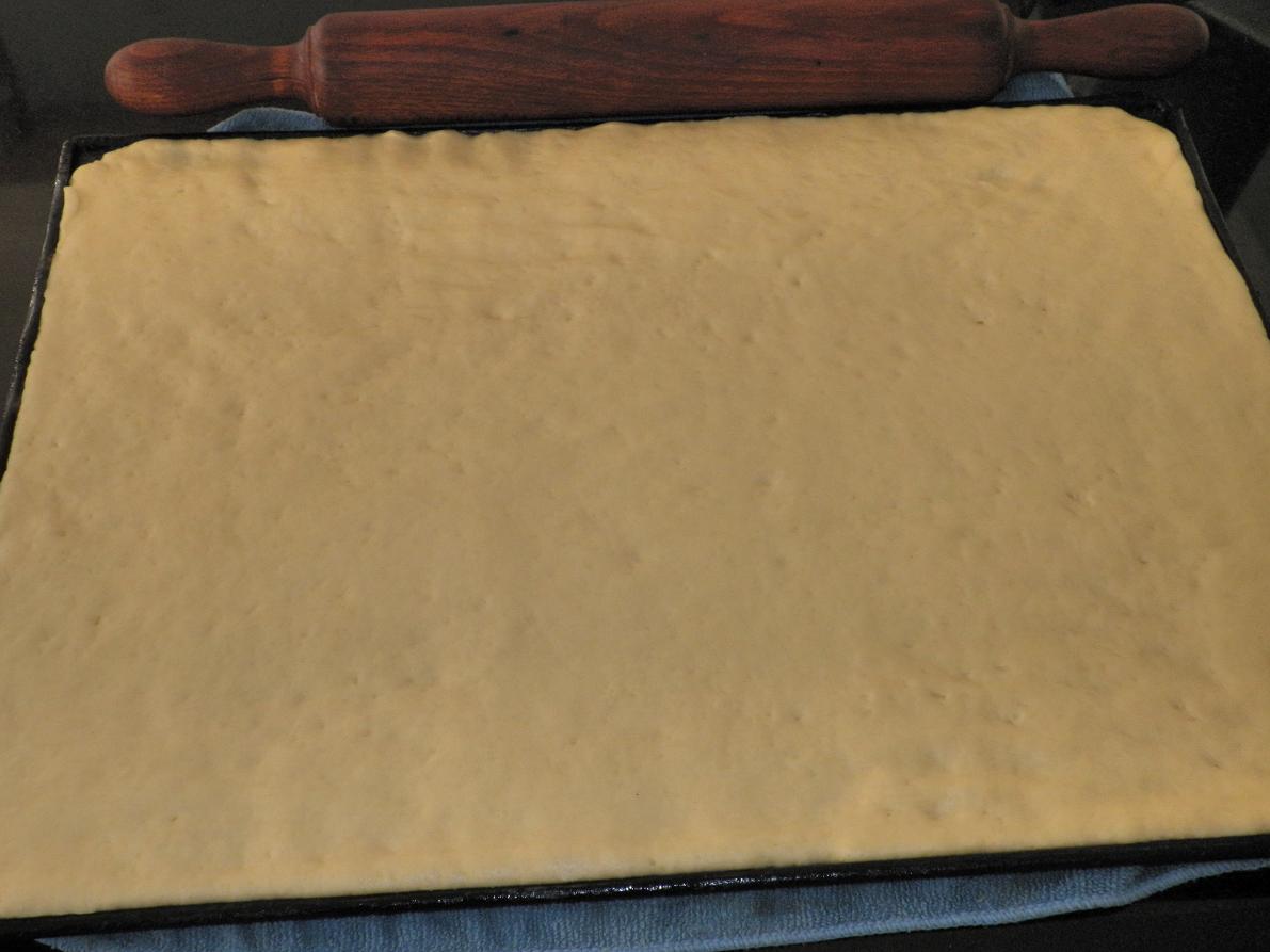 Hay que dejarla fermentar primero hasta que doble el volumen, luego se estira con el rodillo si es posible porque queda mucho mejor pero aparte de que es mas rápido hacerlo con el rodillo que con la mano, se pone el relleno y a los 10 minutos ya se puede meter en el horno.