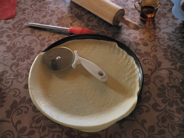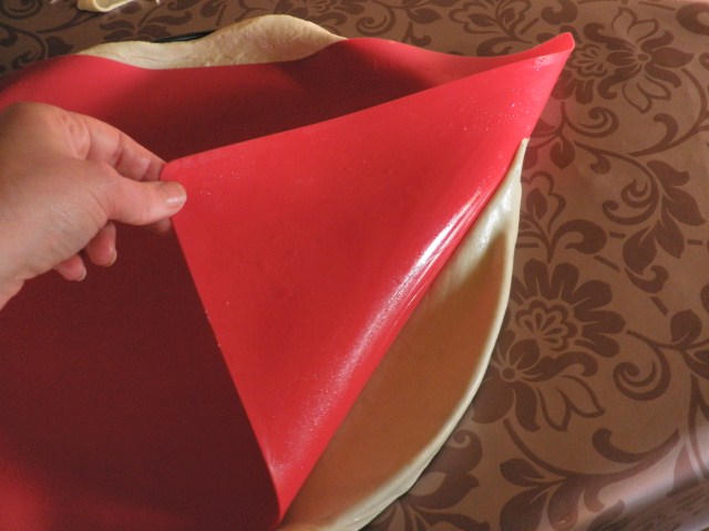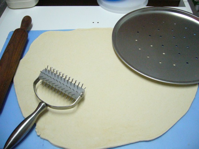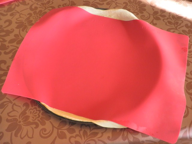 Quan estigui de la gruixa que volem, ben fineta posam una lámina de silicona damunt i ho posam damunt el motlle de pizza (els de forats van molt bé perque la pasta quedi ben cruixent per tot)