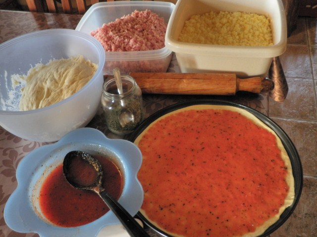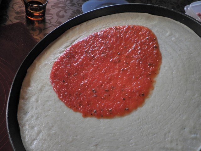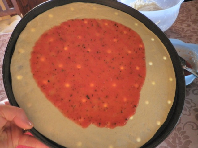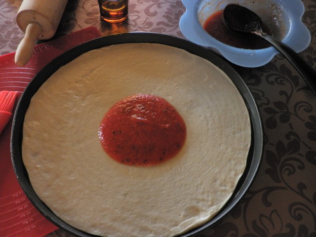 Retallam els sobrants i posam una bona cullerada grossa de tomátiga natural i movem el motle de banda a banda per tal de que sa tomàtiga se compongui per tota sa base.
