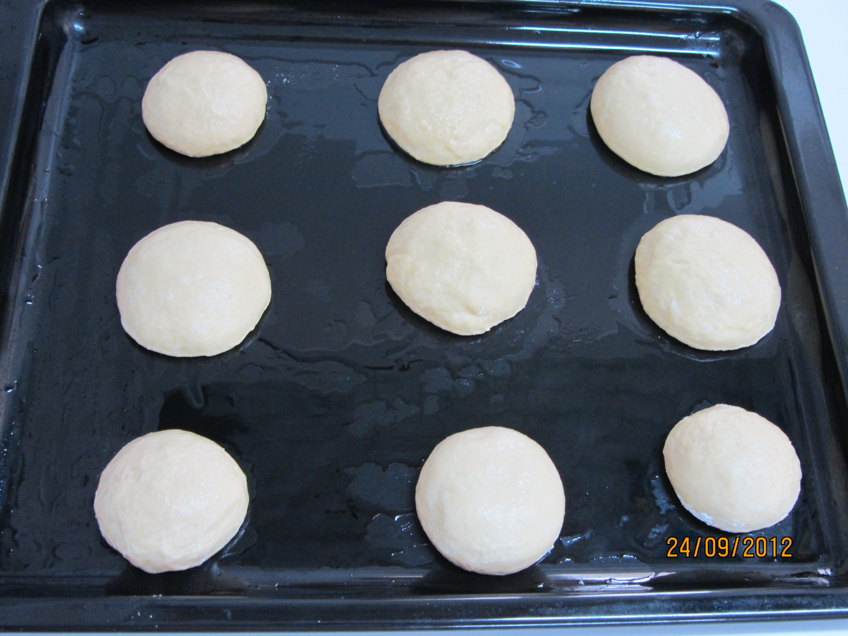 5º després s'han de fer ses bolletes i ens hem de untar les mans d'oli perque vagi millor (jo faig bolletes de 50 gr si les voleu petitetes o 70 gr si les voleu mitjanes i deixau bastant d'espai entre una i l'altra, i la palangana de forn untada de saïm.