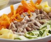 · 3 zanahorias (aprox. 200 g) · 400 g de calabacín sin pelar · 600 g de contramuslos de pollo deshuesados y sin piel cortados en tiras · Sal · Pimienta molida · 40 g de aceite de oliva virgen extra (y un poco más para el pollo) · 1 cebolla cortada en cuartos (aprox. 200 g) · 1 diente de ajo · 1 puerro cortado en rodajas (aprox. 150 g) · 1 tallo de apio cortado en trozos · 1 nabo cortado en trozos (aprox. 100 g) · 300 g de agua · 1 pastilla caldo de pollo (opcional) · 3 patatas cortadas en trozos (aprox. 300 g) · 20 g de mantequilla · 100 g de nata · 1 - 2 cucharadas de mostaza de Dijon · 1 yema de huevo · 1 cucharadita de perejil picado |