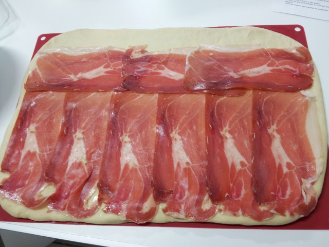 1.- Extendemos la masa en una capa fina, de forma rectangular.Yo la pongo siempre sobre la lamina de silicona así me ayudo para liarlo luego, además sé que así no se me pegará. Pintamos la superficie con mantequilla fundida (nos podemos ayudar de un pincel para cocina). Colocamos encima las lonchas de jamón serrano sin llegar hasta el borde de la masa.