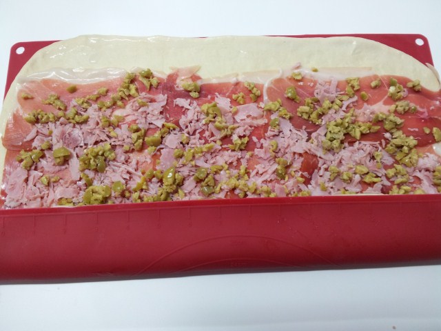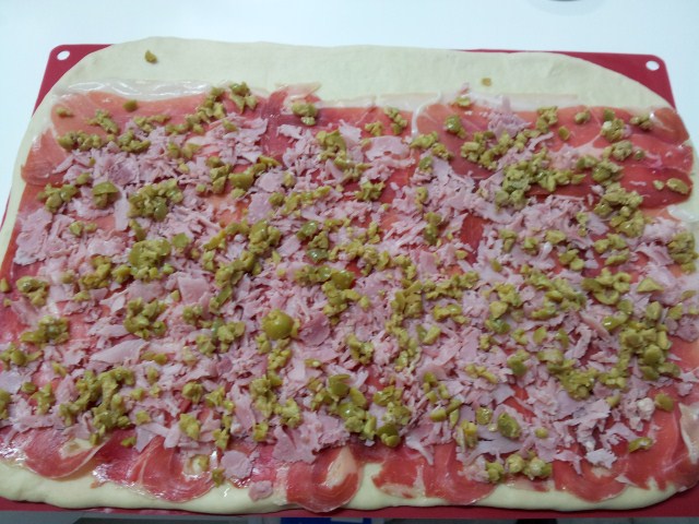 2.- Añadimos el jamón de york, encima las aceitunas.