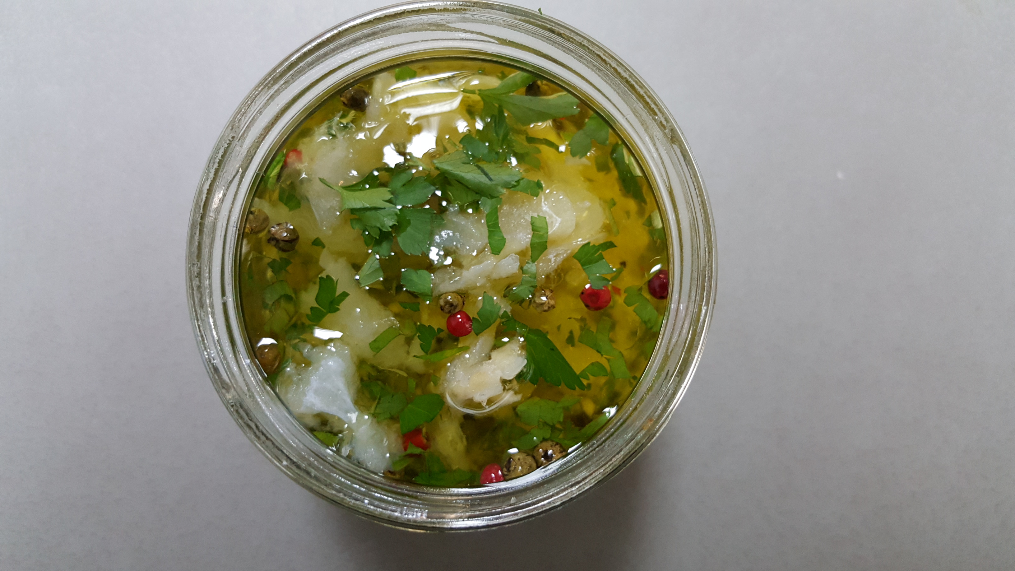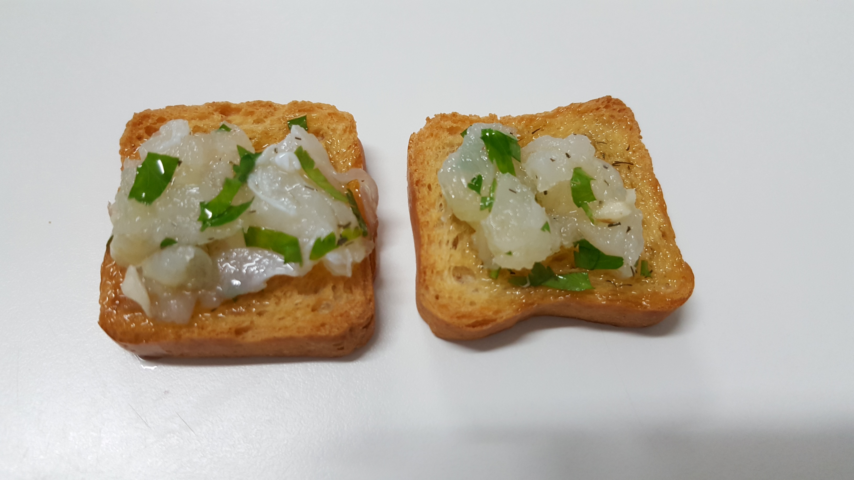 7- Freír patatas panaderas, servir por encima las gambitas con su jugo, que cale las patatas y cubrir con la ajonesa.