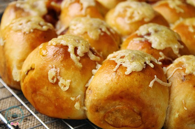 Retiramos la masa del bol. Amasamos sobre la superficie de trabajo y la dividimos en 18 trozos (los míos de 35 gramos cada uno). Con el rodillo vamos estirando uno de los trozos hasta obtener un círculo( mientras tanto mantenemos tapados los demás trozos de masa para que no se sequen).Ponemos en el centro 1 cucharadita de tomate frito, un poco de queso y una rodaja de salami (las rodajas eran grandes y las corte en trocitos con una tijera de cocina). Los cerramos haciendo como un sobre y luego una bolita en medio de las manos. Repetimos el procedimiento con el resto de la masa. Colocamos las bolas de masa con los pliegues hacia bajo en el molde preparado, comenzamos por el centro y el resto todo alrededor. Pintamos con huevo batido.