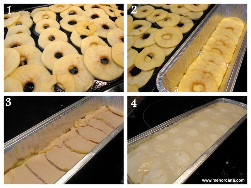 Poner en un molde rectangular (28 x8 cm.) una capa de manzanas solapándolas para que el agujero de las semillas quede tapado, encima ir cortando el foie en rodajas finas y colocándolo sobre las manzanas, volver a poner otra capa de manzana y otra de foie hasta completar el molde con 5 capas de manzana y 4 de foie.